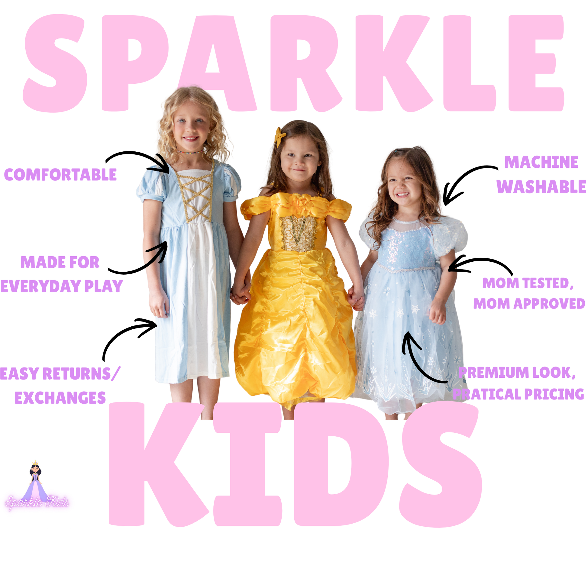 Elegant white satin bodice with crystal-inspired shimmer accents ✨ Long sheer sleeves for a regal snow-queen silhouette 👑 Layered tulle skirt with subtle sparkle for magical twirl power 💫 Stretch-fit design for comfort, flexibility, and growing room 🤍 Lightweight, breathable fabrics that won’t itch or feel stiff Wash-friendly and easy to care for — gentle cycle cold, lay flat or hang to dry 🧺 Designed to maintain shape, color, and shimmer wear after wear Includes a FREE princess tiara (no add-on needed) 👑
